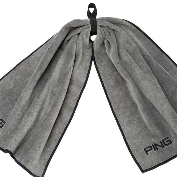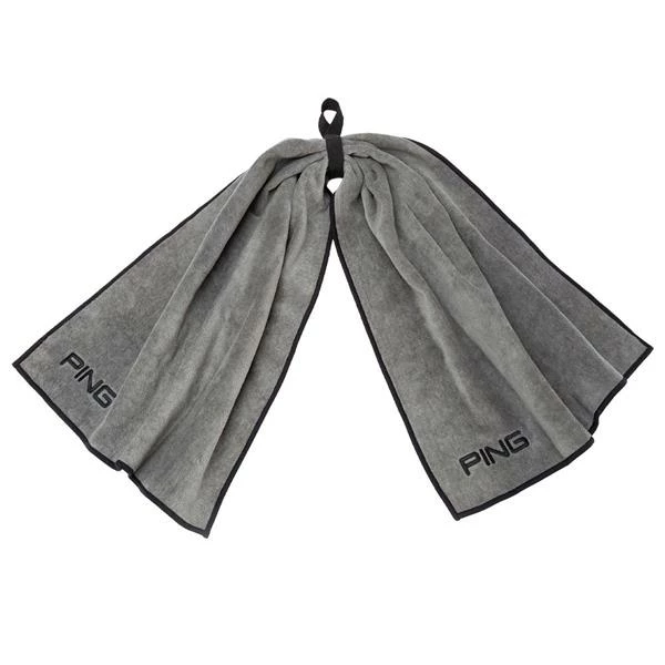 It’s made of super-soft 100% cotton and this bow tie towel is big — 38″ long by 16″ wide unfolded. Offers a webbing loop for easy attachment to a golf bag and has embroidered PING logos.